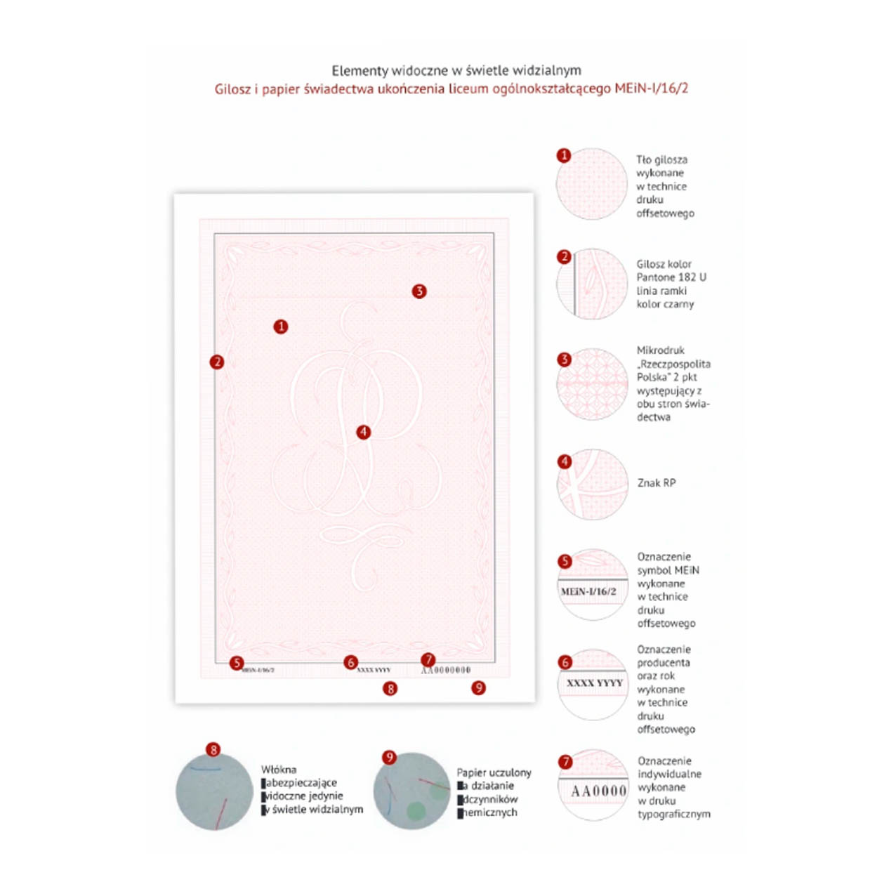 Blankiet świadectwa ukończenia liceum ogólnokształcącego z zabezpieczeniami (papier specjalny, UV, numeracja)